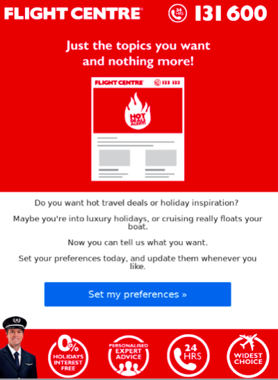 One of the crucial vital issues e-mail subscribers need is alternative over what sorts of emails they obtain, and the way regularly. For senders, the effectiveness of alternative is clearly proven by the launch of Flight Centre’s new desire middle.
